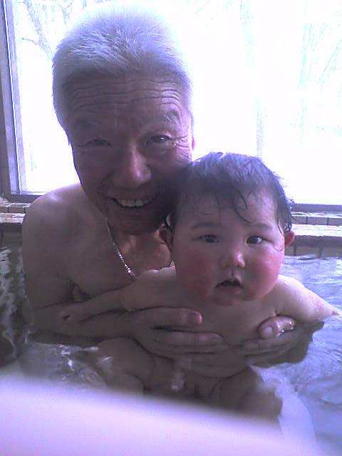 青葉は温泉2回目? 前も同じつちや旅館でしたが、あのころはまだ1ヶ月だったからよく分かってなかったろうなー。 今回はお湯が熱めではじめちょっといやそうだったけど、 慣れたらやっぱり気持ちよさそう。 ひいおじいちゃんとばちゃばちゃしてました。 父も窓越しに雪を見ながら温泉につかり、仕事でこった体がだいぶほぐれたよ。